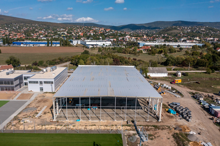A sportcsarnoknál a szerkezet és födémpanelek elhelyezése elkészült, jelenleg a csarnok oldalának panelezése és az épület bezárása történik.