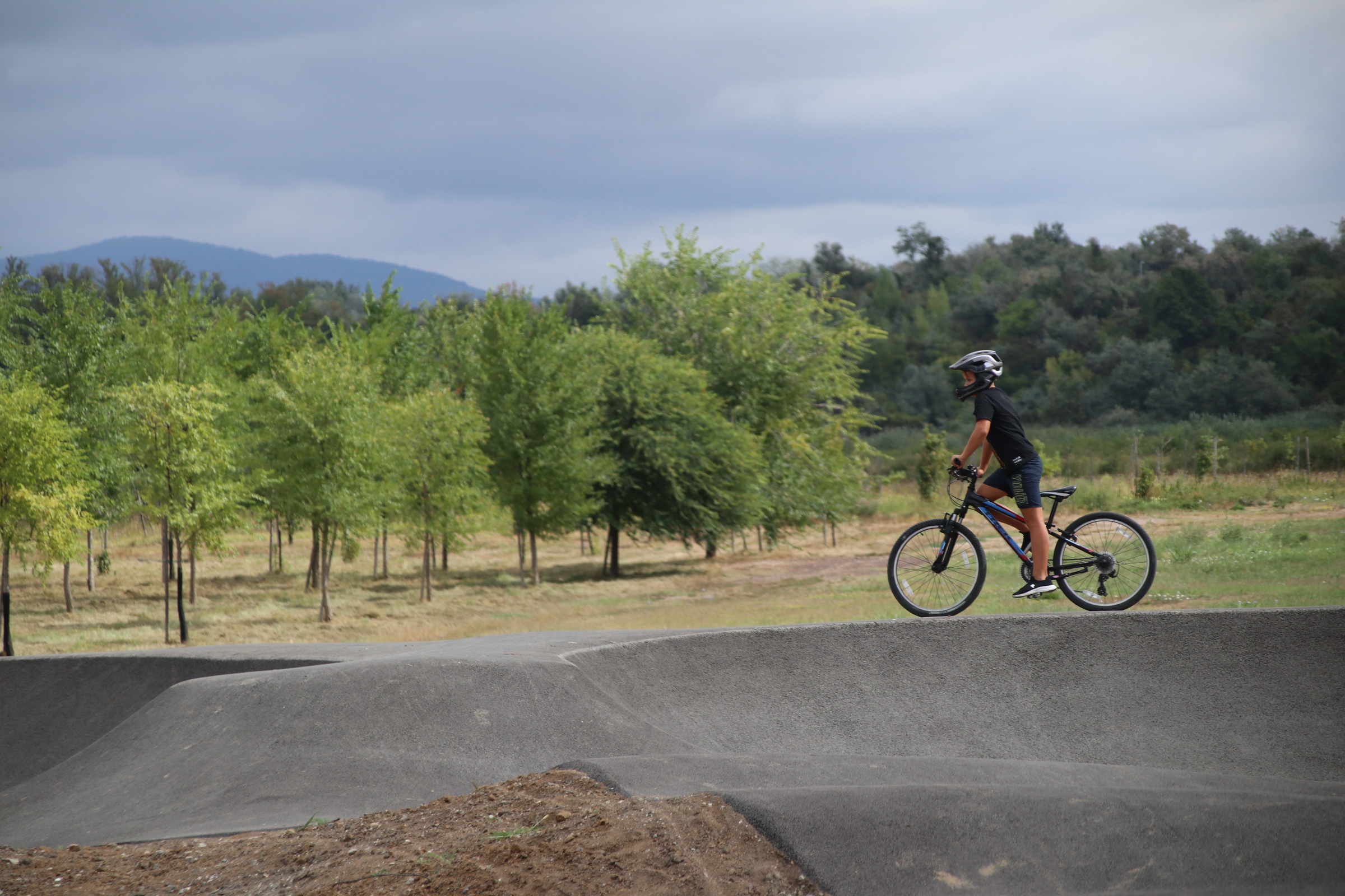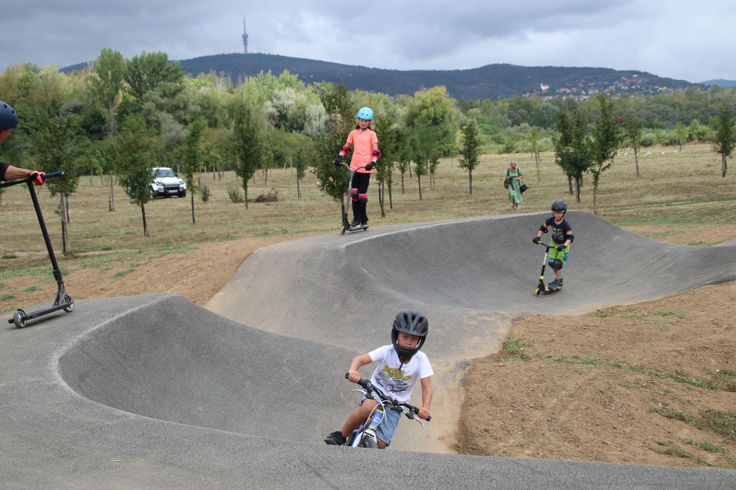 - Köszönöm szépen a méltató szavakat! Hadd kezdjem én is azzal, hogy egyrészt az állami támogatást, másrészt az önkormányzat vállalását és a sok-sok cég vezetőinek támogatását megköszönjem! Pár praktikus információt még tudok mondani, például, hogy csak kavicsból 1100 tonna került be, és nagyjából ilyen tömegű föld került be különböző minőségben beépítésre. Több mint 60 millió forintból tudtuk megvalósítani a projektet, ez 45-tel indult. Egyszer meg kellett hosszabbítanunk a pályázatot, ami nem egy automatikus dolog, ehhez is köszönjük a rugalmasságot, ez szintén hozzájárult a megvalósuláshoz. A pályázathoz még meg kell említenem a napvitorlákat, a biciklitárolót, a szerviztornyot, a padokat, illetve a későbbiekben ide beköttetendő vízzel működő Zsolnay ivókutat, amelyet tervezünk. Ezt én jelenleg komfortzónának hívom, amit biztosítani szeretnénk a szülőknek, sportolóknak, pályát használóknak. Tervezünk még futóköröket a város több pontján, azért is, hogy ne csak egy helyszínre koncentráljunk, hanem a különböző városrészeket is fejlesszük ezen a területen. Elképesztő volt látni, ahogy a munkagépek láttán megjelentek az első érdeklődők is, kicsik és nagyok támaszkodtak, hogy vajon mi készül itt. Amikor egy picit is púposabb volt, már felmentek volna, a próbaüzem alatt pedig napról-napra egyre népszerűbb lett a pálya, jó volt nagyon látni a sok embert, akik használták, a picik is nagyon ügyesek rajta. Van egy kezdő és egy haladó rész, ki fogjuk egészíteni a későbbiekben a start hellyel, matricákkal, csíkokkal. Kicsit kopni kell a pályának ahhoz, hogy a maximális időtartamot utána kibírja. Nagyon köszönöm még egyszer mindenkinek, aki hozzájárult! Szeretném felkérni a résztvevőket egy bejárásra, majd pedig azok a gyerekek, akiket megszólítottunk az elmúlt napokban, egy kis bemutatót tartanak nekünk.