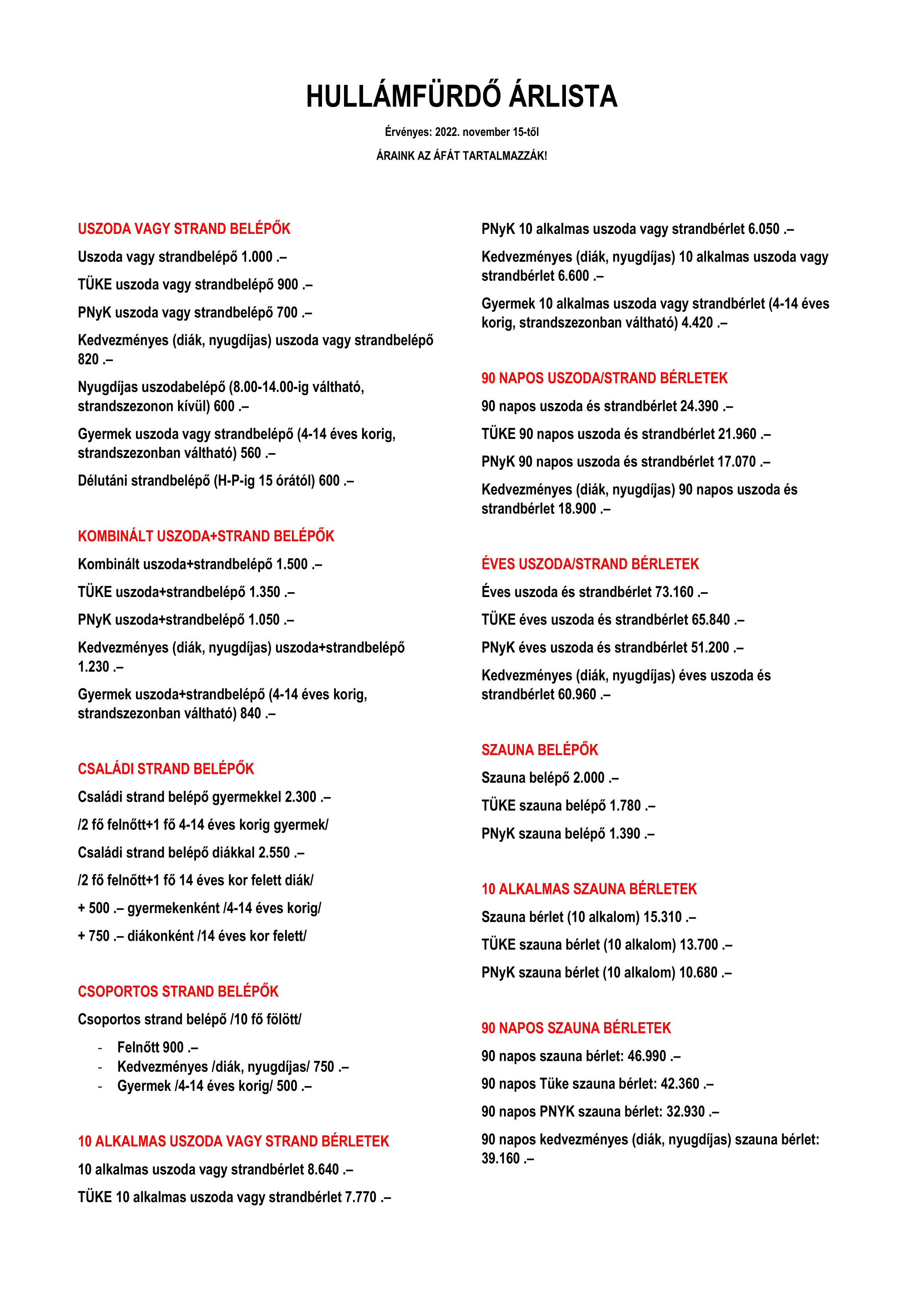 Tájékoztatjuk kedves Vendégeinket, hogy az Abay Nemes Oszkár Sportuszoda árlistájának egy része a holnapi naptól, azaz 2022. november 15-től módosul.