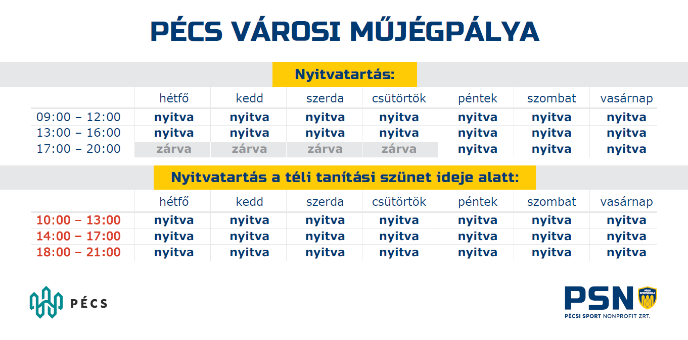 A Pécs Városi Műjégpálya a téli szünetben is várja a látogatókat, hétfőtől vasárnapig 10 és 13 óra, 14 és 17 óra, valamint 18 és 21 óra között. Az ünnepi nyitvatartásról hamarosan tájékoztatjuk a korcsolyázni vágyókat.