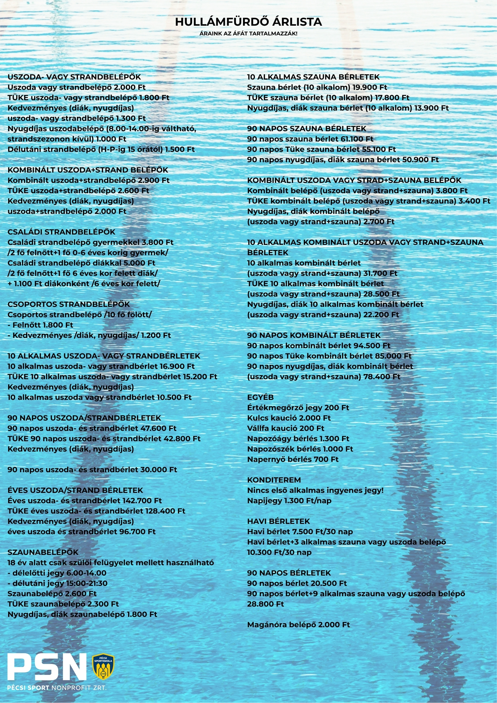 Tájékoztatjuk a lakosságot, hogy a pécsi Hullámfürdő szolgáltatásainak árai, június 2-ától, az előre jelzett mértékben változnak.
