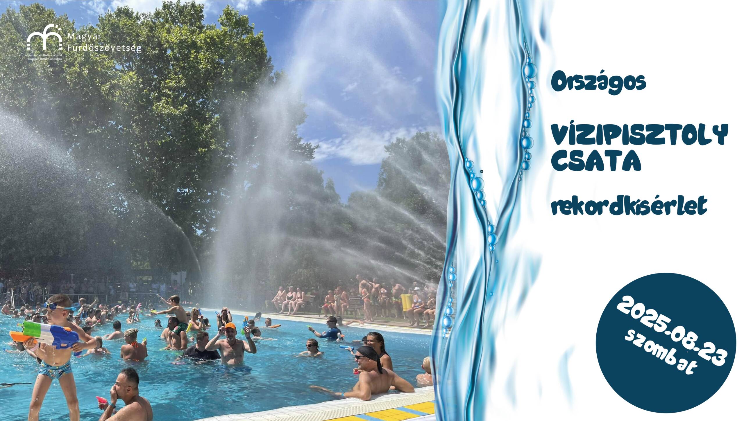 Pécs idén is csatlakozott a III. Országos Vízipisztoly-csatához, amit a Magyar Fürdőszövetség hirdetett meg. Augusztus 23-án 13 órától, a Hullámfürdőben várunk mindenkit, aki részt szeretne venni a rekordkísérletben. Az első száz, vízipisztollyal érkező fürdővendég aznap délután ingyen strandolhat. A cél, hogy a 2023-as 5900 főnél többen legyünk országszerte. Tavaly 5500 résztvevője volt a rekordkísérletnek.