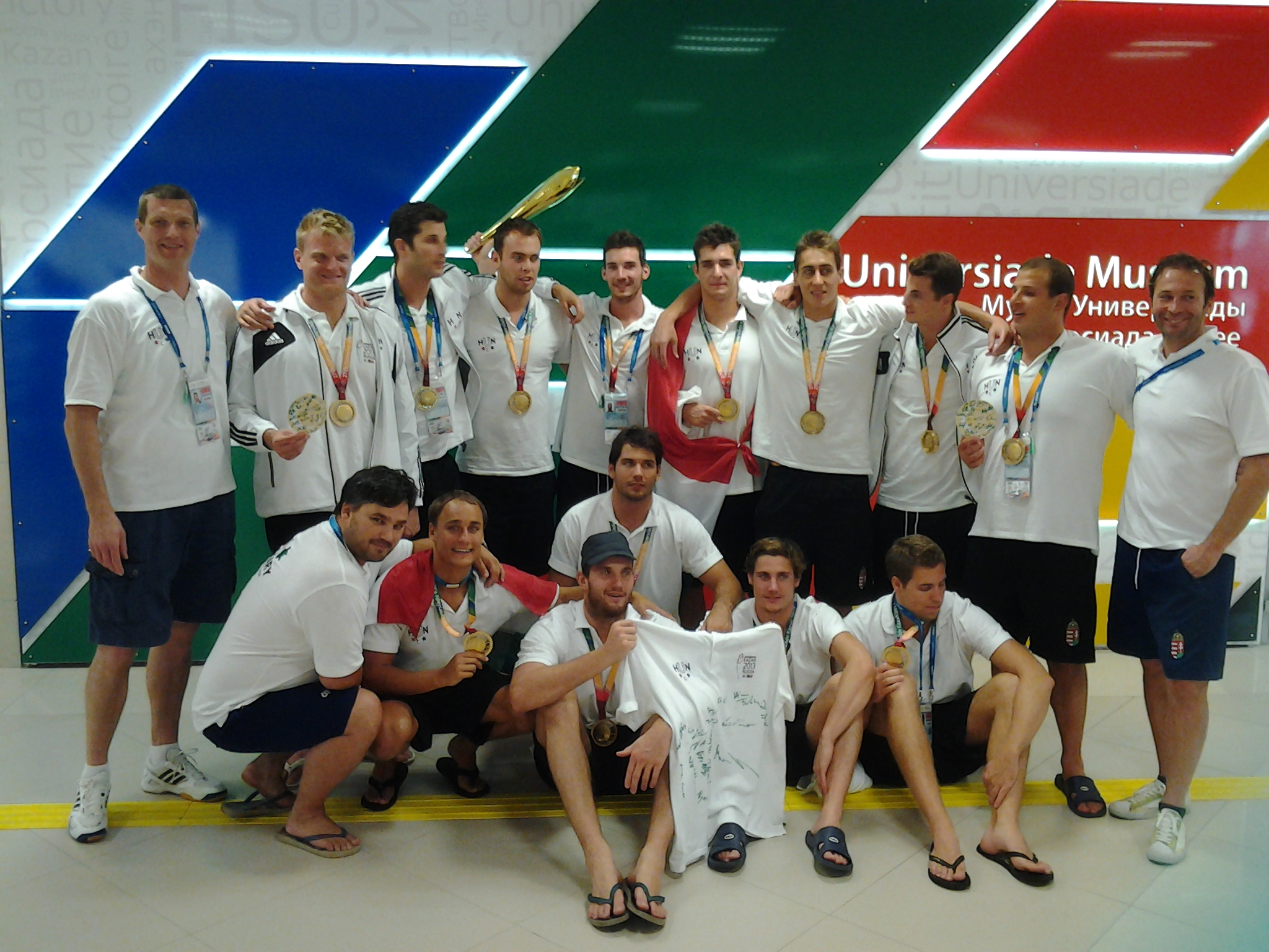 A pólós fiúk megmutatták a kazanyi közönségnek, hogy miként szurkolnak a magyarok. A Taipei-Magyarország női kosárlabda-mérkőzésre kilátogató vízilabdázók nem bízták a véletlenre a drukkolást, az összecsapás félidejében az ellenfél megzavarása érdekében a pályán mutatták meg kiemelkedő kosártudásukat. A rendezőkön kívül mindenki örömmel vette az attrakciót. :)